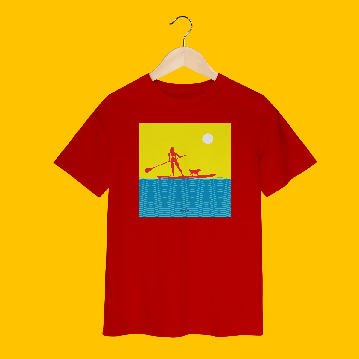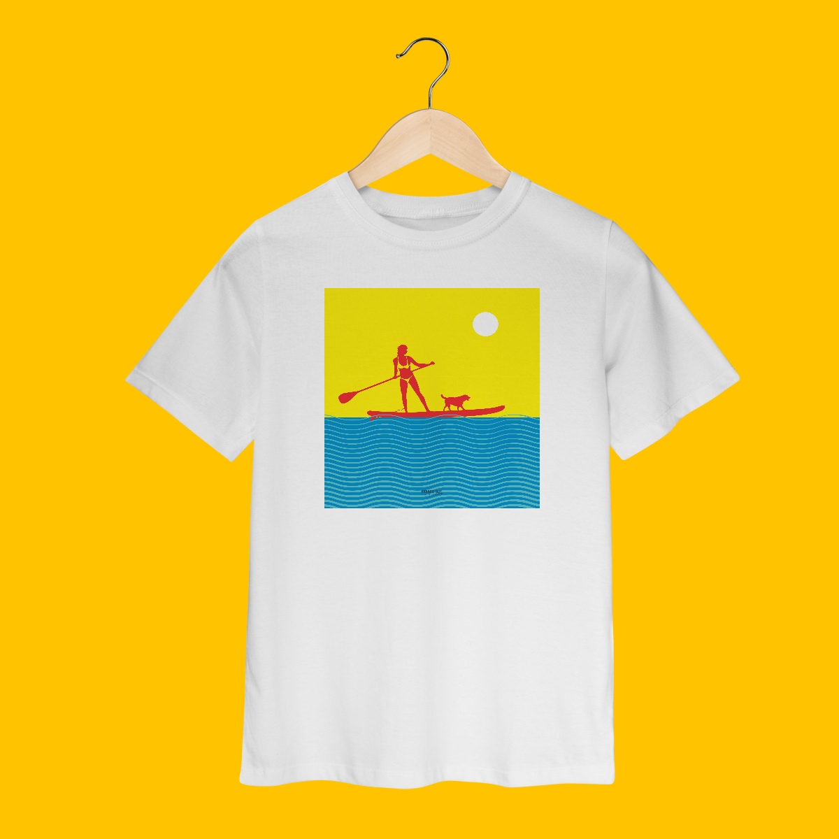 A cena inusitada era uma mulher segurando o remo de SUP, acompanhada de seu cão, onde pela conversa ouvida, ambos iam juntos para o mar. Daí surgiu a estampa.