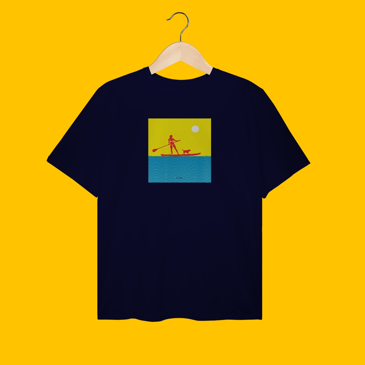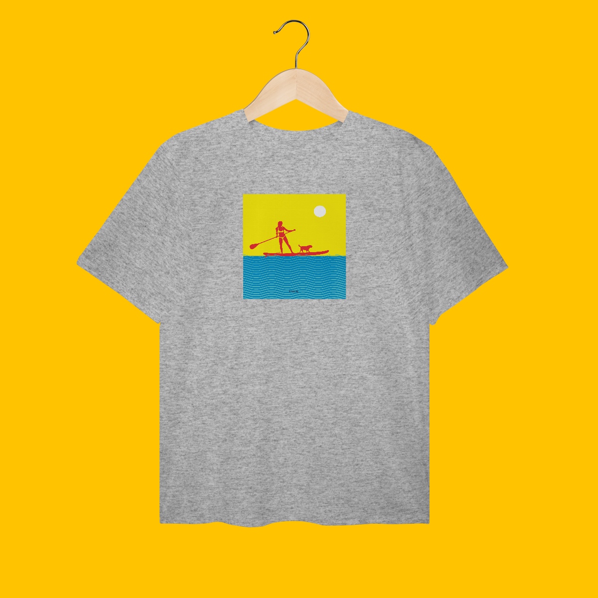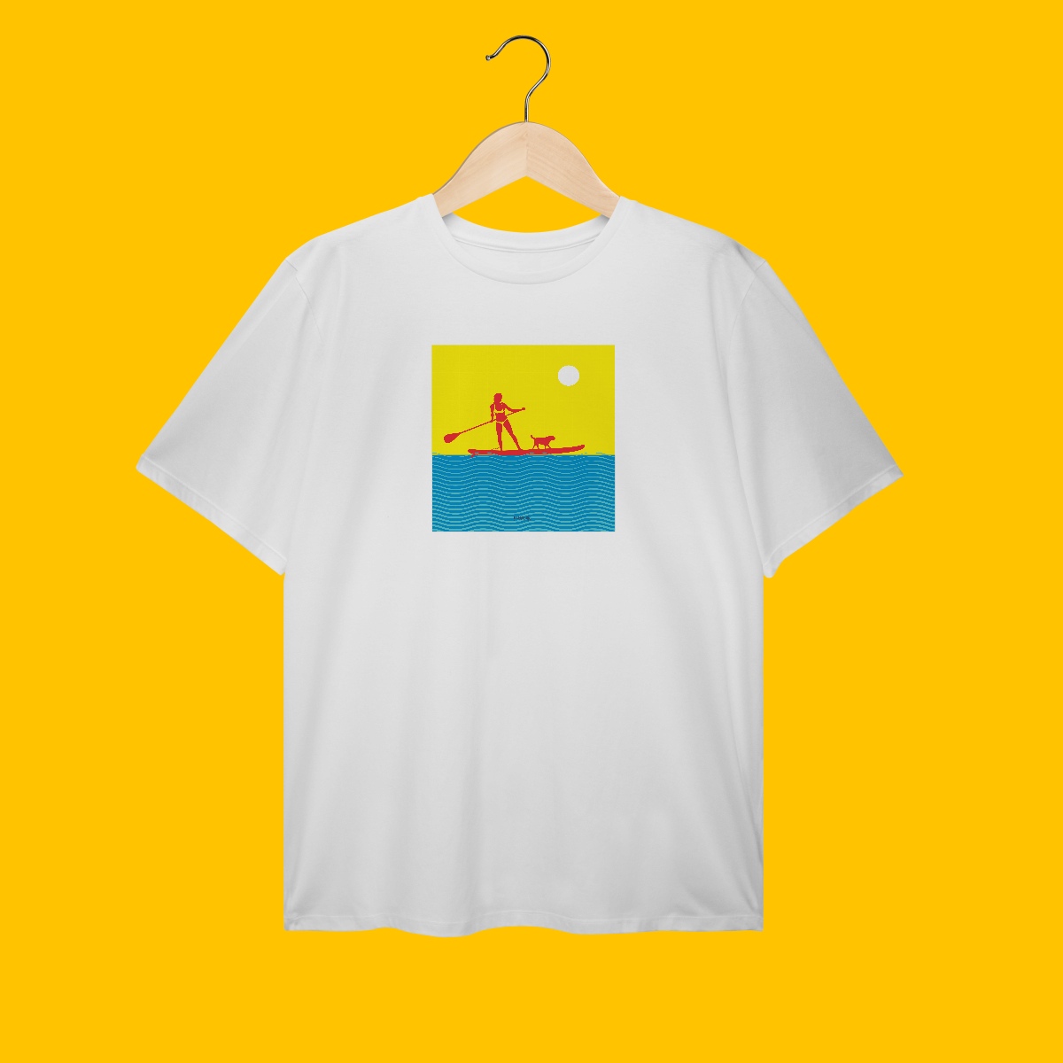 A cena inusitada era uma mulher segurando o remo de SUP, acompanhada de seu cão, onde pela conversa ouvida, ambos iam juntos para o mar. Daí surgiu a estampa.